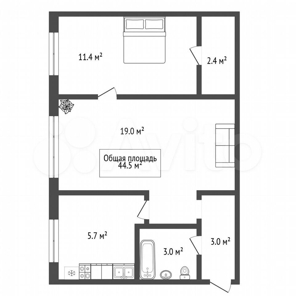 - Общая площадь 44.5 м2