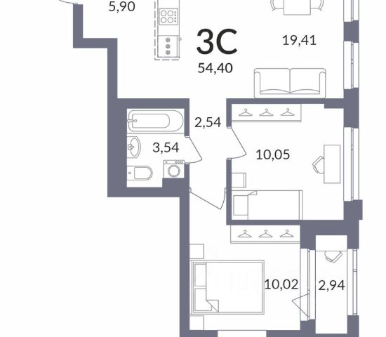- Общая площадь 54.3 м2