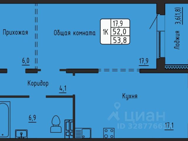 - Общая площадь: 53.8 м2