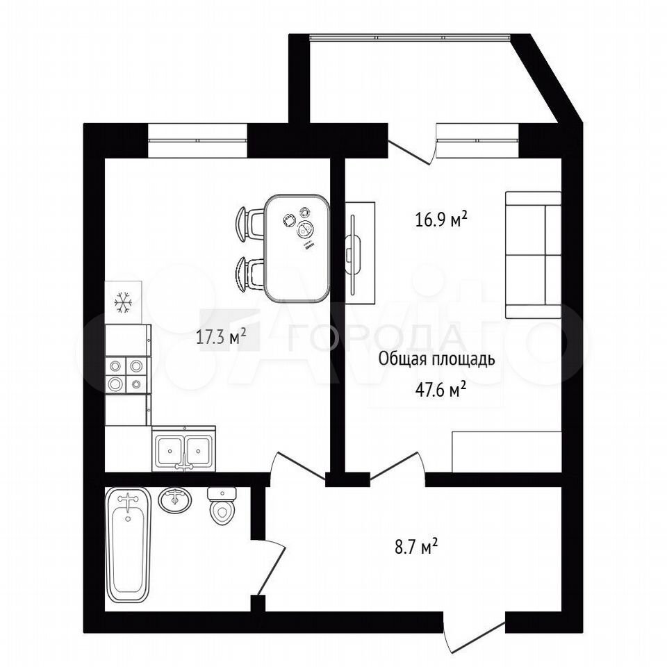 - Общая площадь 47.6 м2