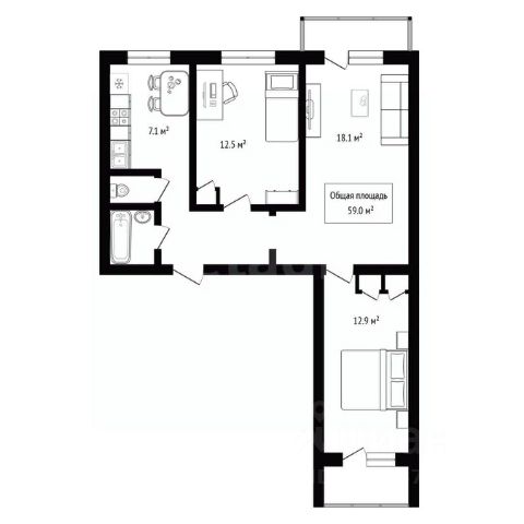 - Общая площадь 59 м2