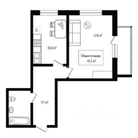 - Общая площадь 43.1 м2