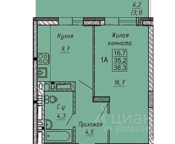 - Общая площадь 35.5 м2