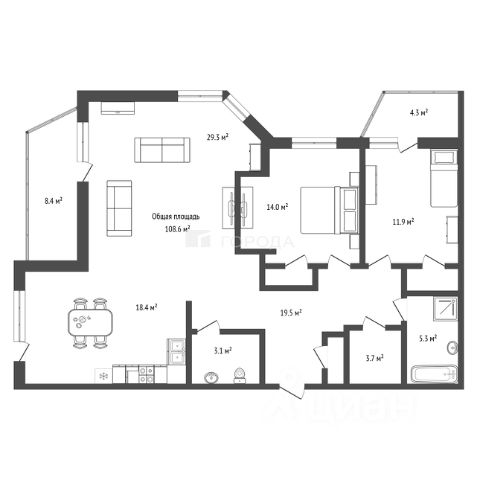 - Общая площадь: 108.6 м2