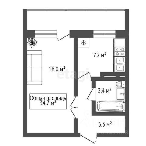 - Общая площадь 34.5 м2