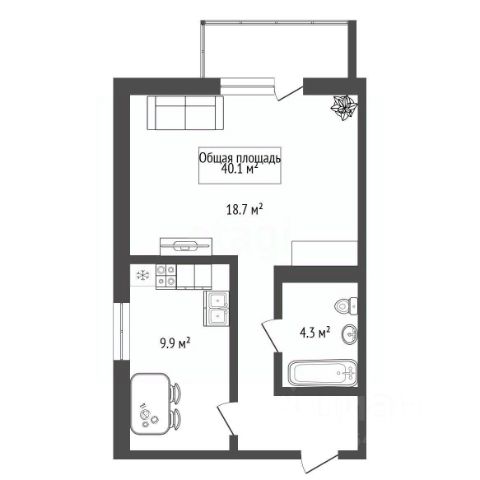 - Общая площадь 40.1 м2