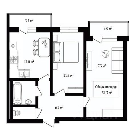 - Общая площадь 51.3 м2