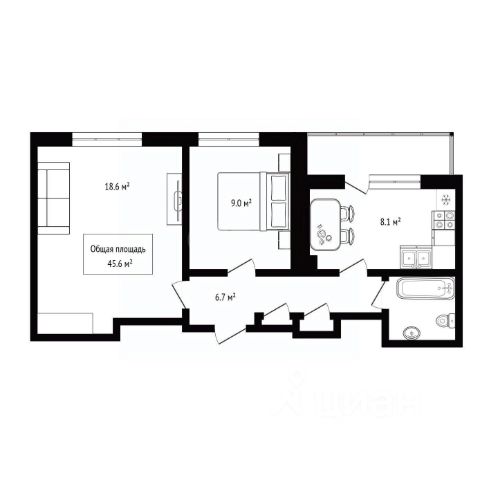 - Общая площадь 45.6 м2
