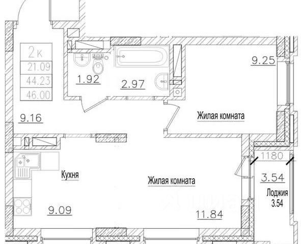 - Общая площадь 44.4 м2