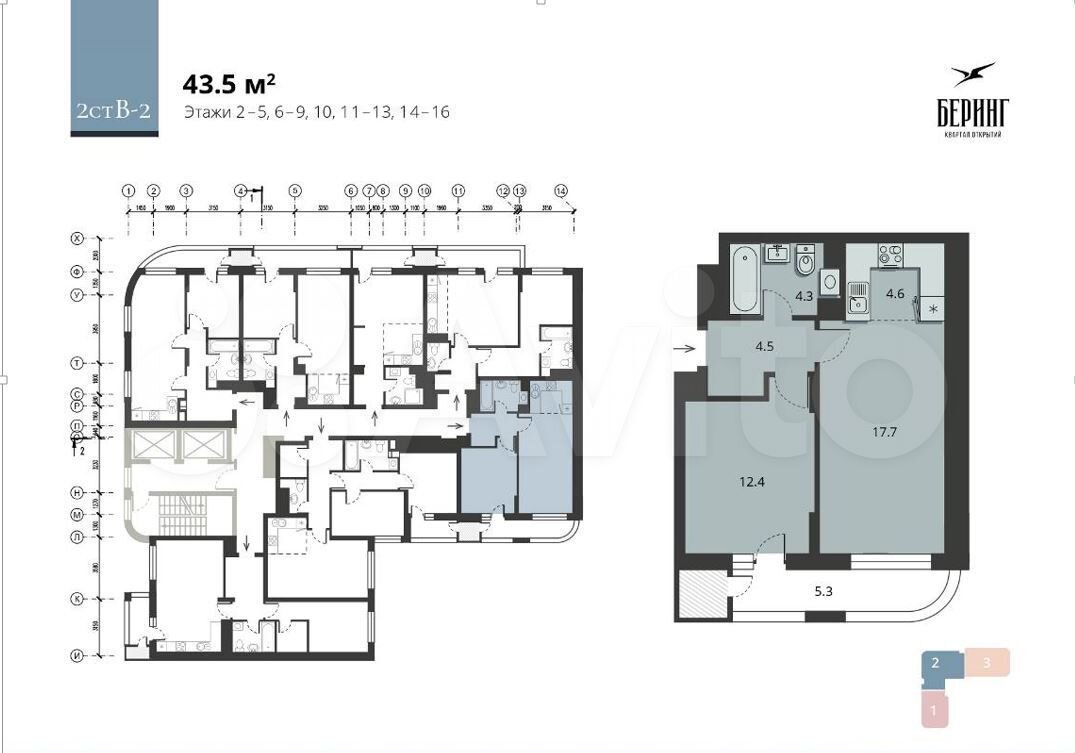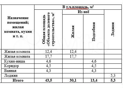 - Общая площадь: 43.5 м2