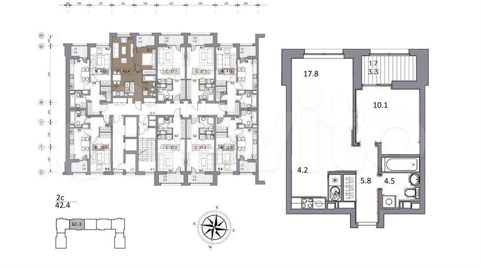 - Общая площадь: 42.4 м2