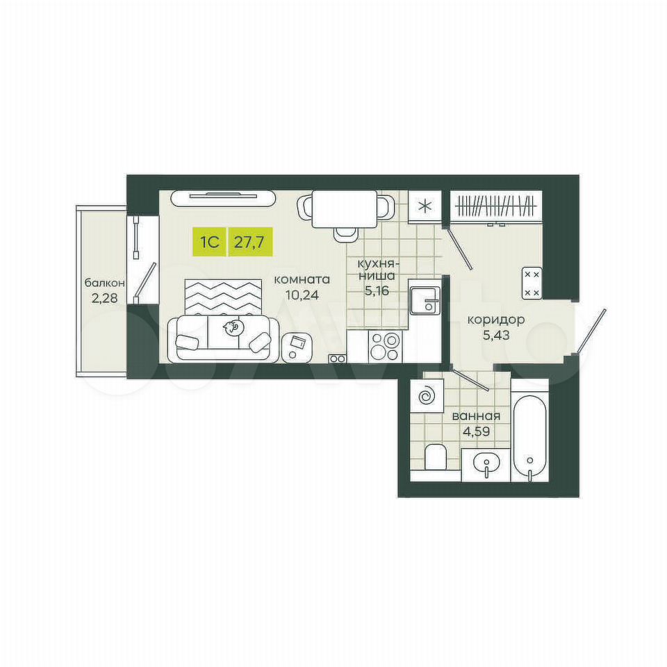 - Общая площадь 27.7 м2