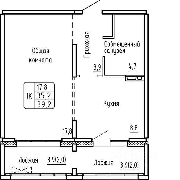 - Общая площадь 39.1 м2
