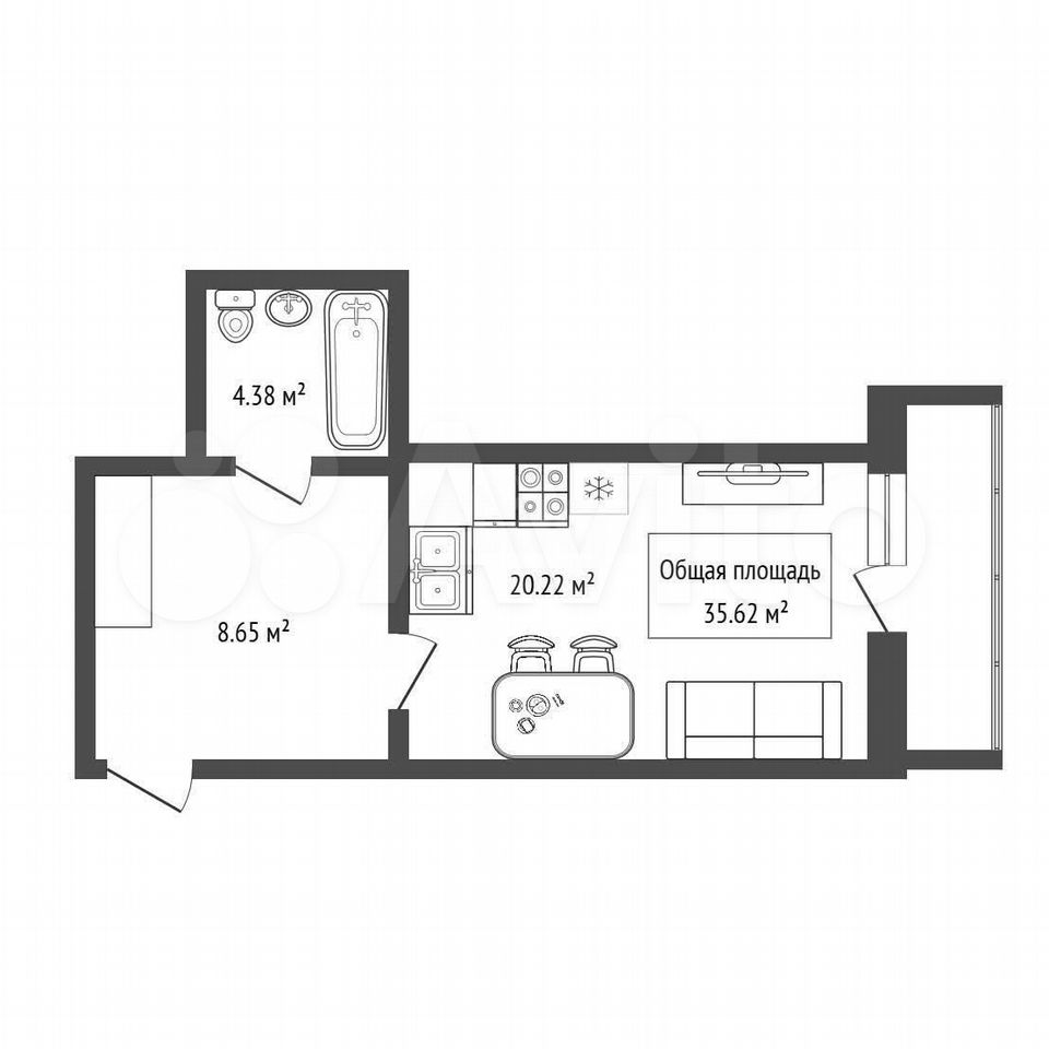 - Общая площадь 35.6 м2