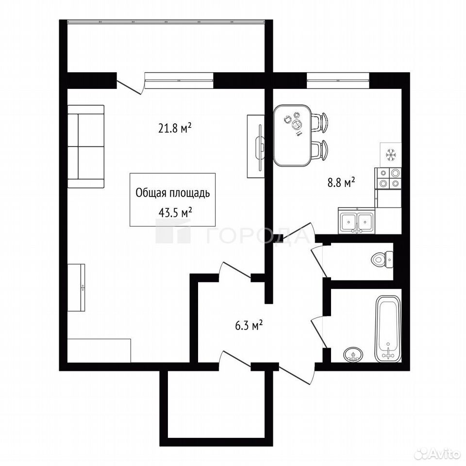 - Общая площадь 43.5 м2