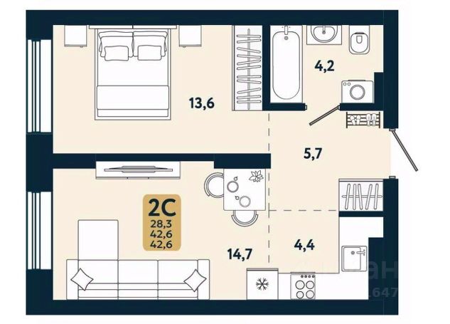 - Общая площадь 42.6 м2