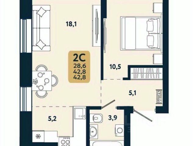 - Общая площадь 42.8 м2